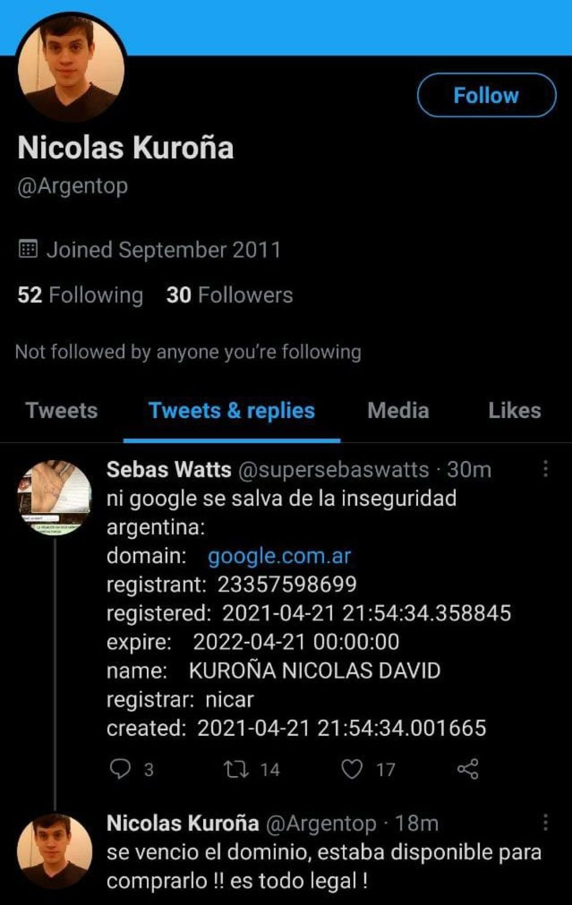 En 2015, un exempleado de google llamado sanmay ved compró el dominio google.com por razones similares: La sorpresa fue mayúscula luego de que se conoció el mensaje de un joven que afirmó que había comprado el dominio de google en argentina porque. Google argentina se cayó anoche y en el registro oficial de los sitios web en el país figuraba a nombre de un tuitero. Haga clic en el icono del carrito de la compra para. Lo insólito llegó después por este tuit que se hizo viral: